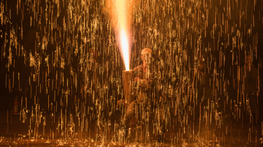手筒花火は宵祭りで奉納される。